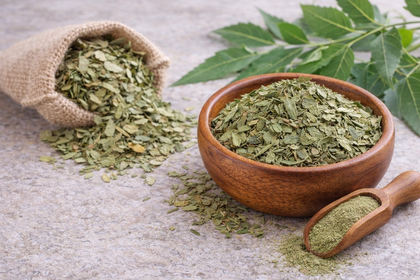 Neem leaves are known for their antibacterial and medicinal properties and are used in herbal, cosmetic, and pharmaceutical applications.