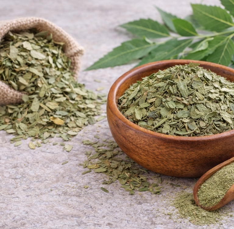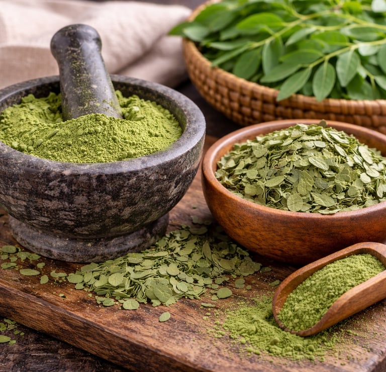 Moringa leaves are nutrient-rich herbs widely used in health supplements, food products, and herbal formulations.