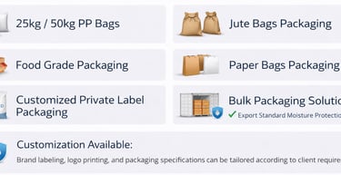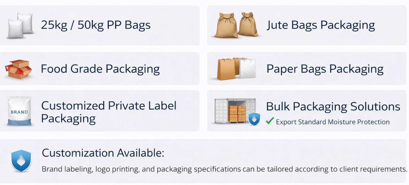 We offer flexible and secure packaging solutions designed to maintain product quality during storage and international transportation, with customization available as per buyer requirements.