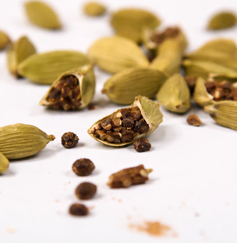 Highly aromatic cardamom pods prized for their rich flavor and use in culinary and beverage industries.